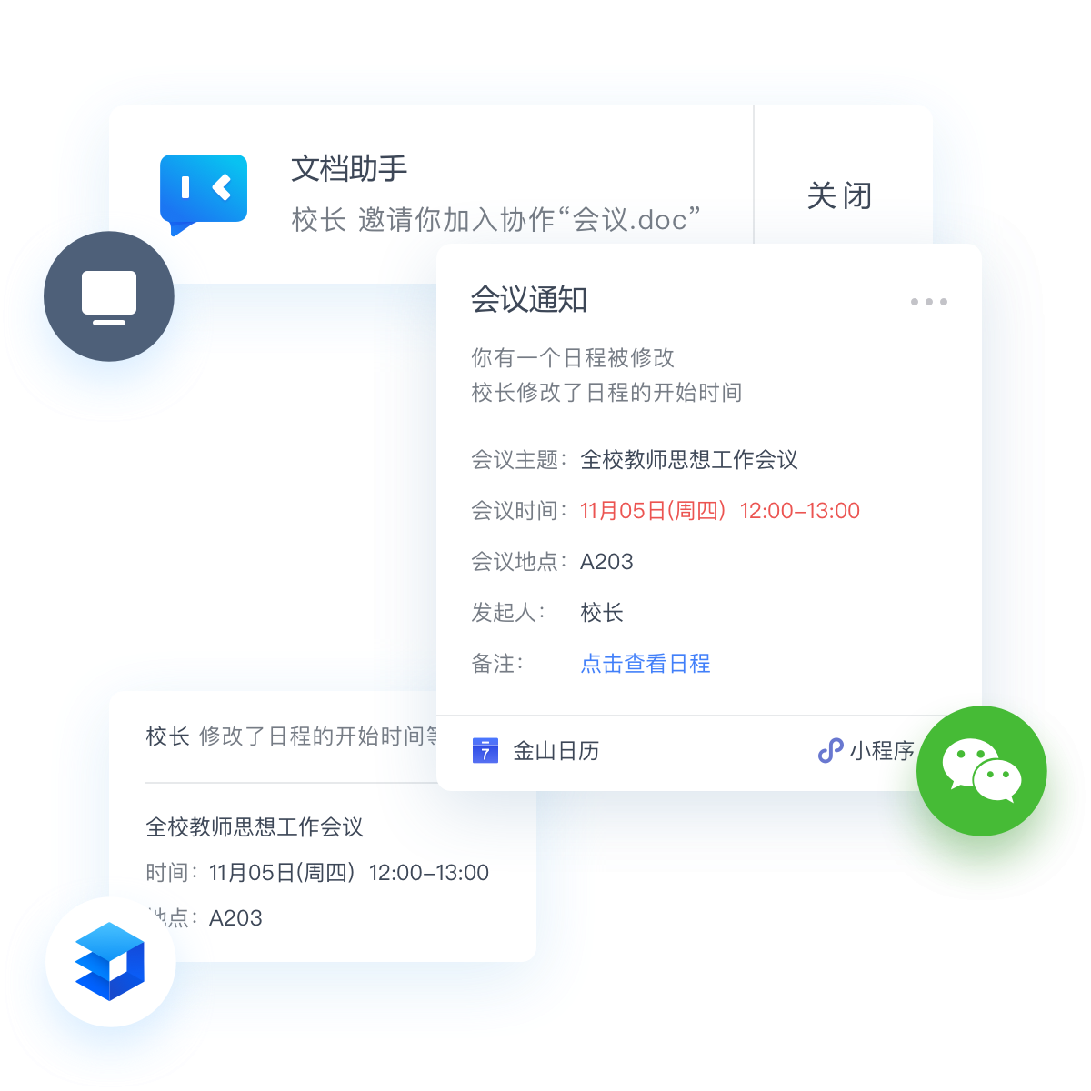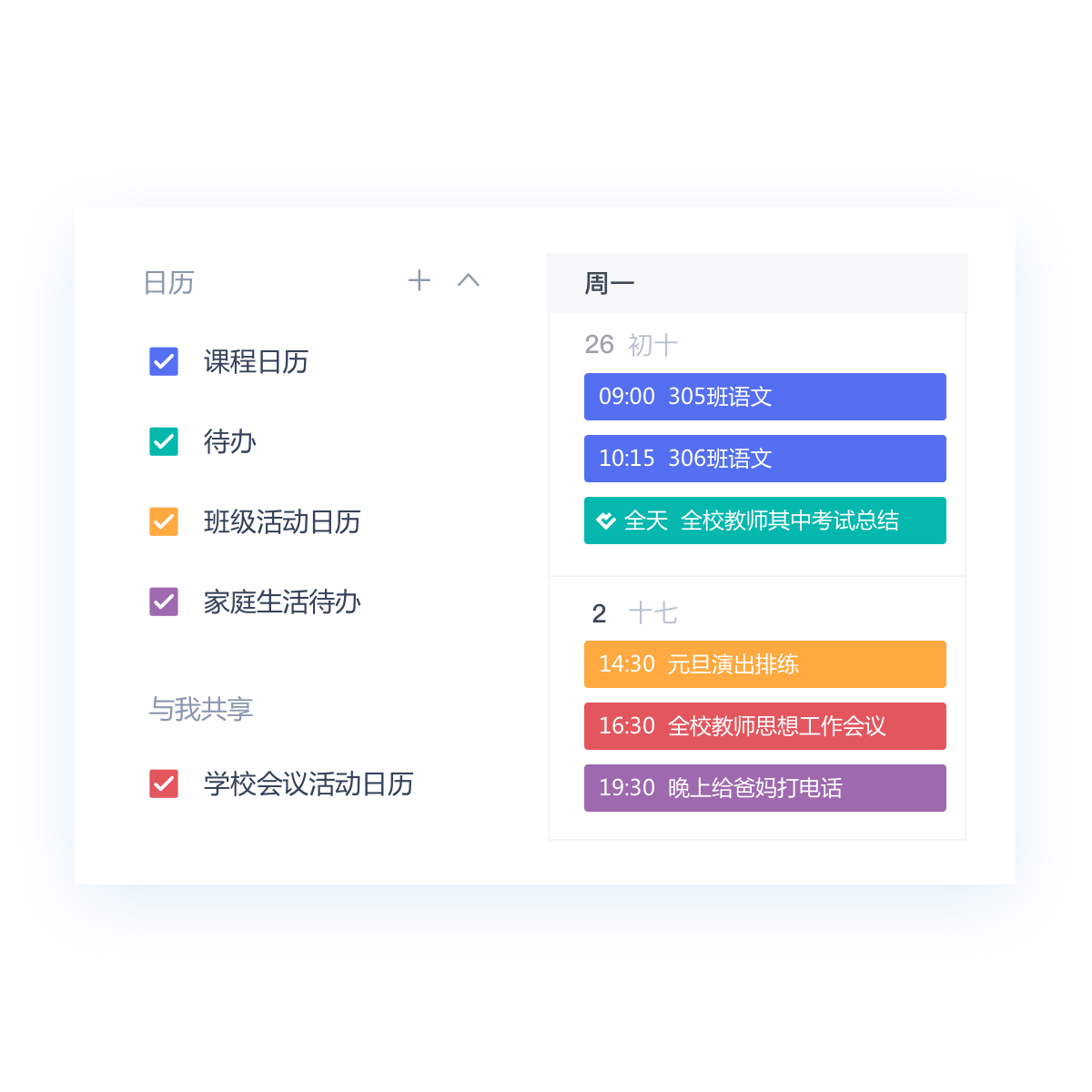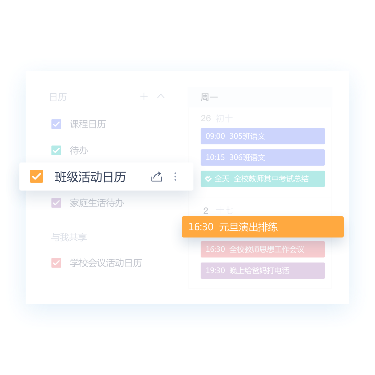 支持多平台,教职工可以在手机、电脑上随时随地的添加日程、 待办、管理和分享日历,面对生活、工作这两种不同场景, 可新建对应的日历将他们区分开来
